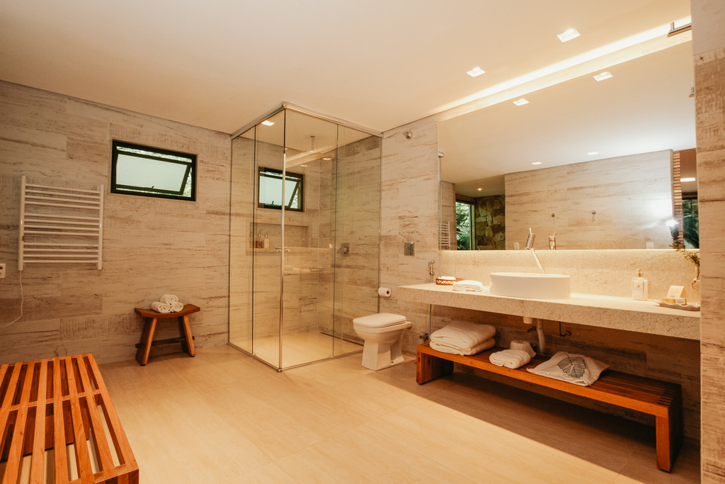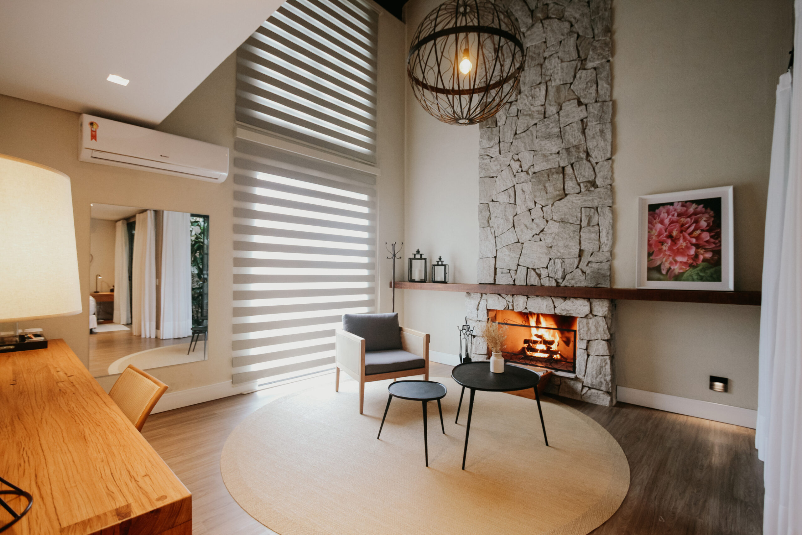 O chalé conta com um ambiente amplo e sereno, proporcionando aos hóspedes uma experiência revigorante junto à lareira em noites mais frescas.